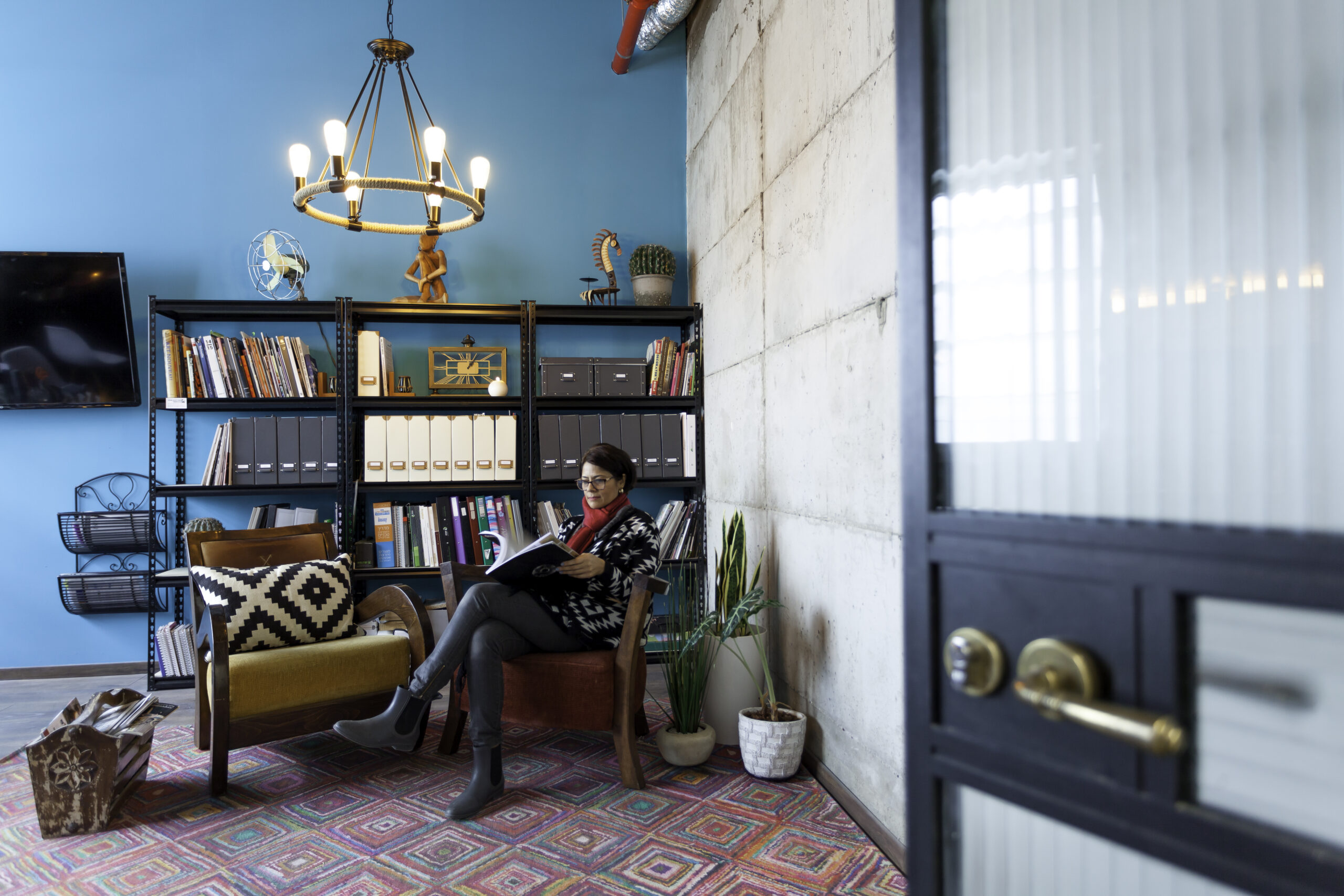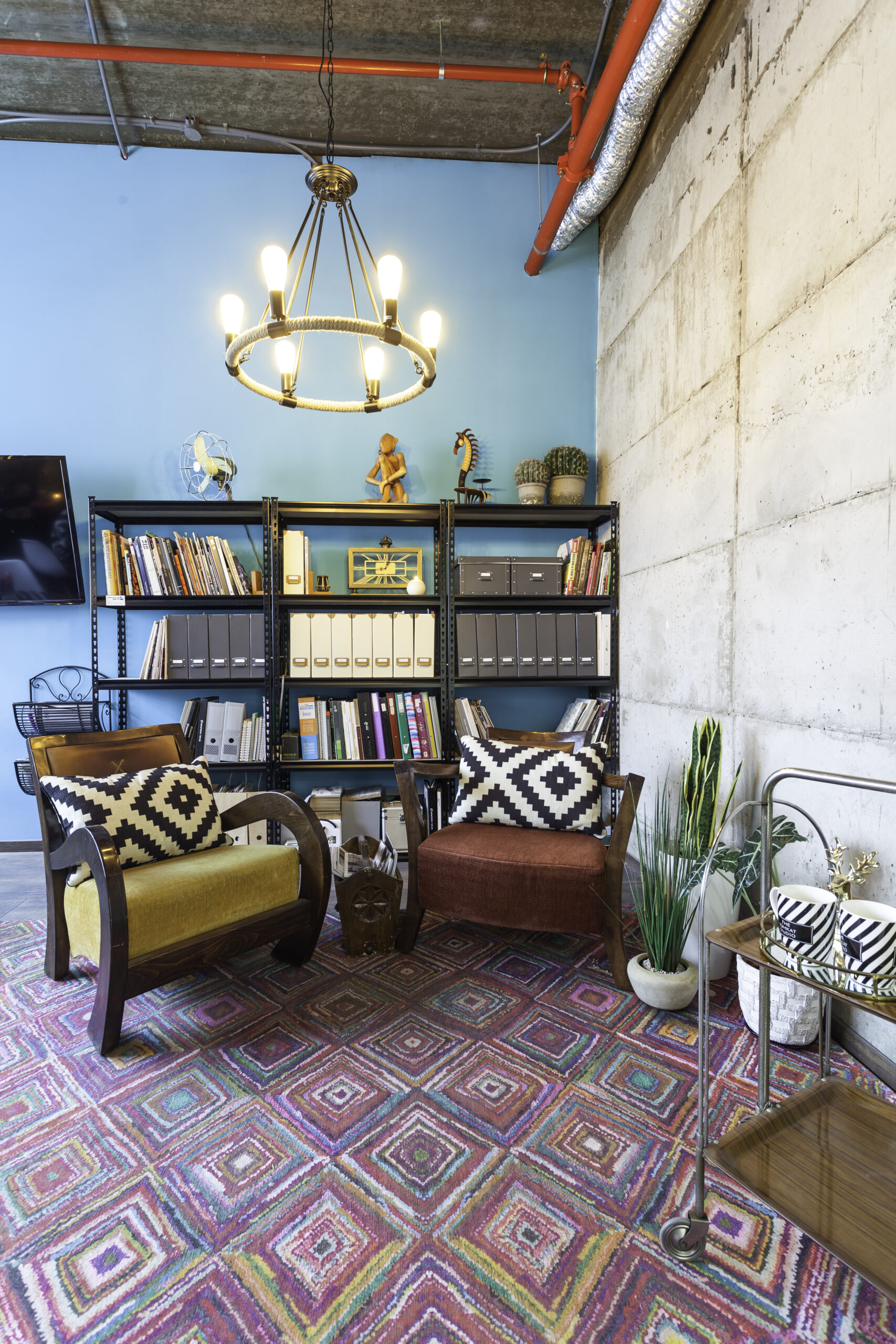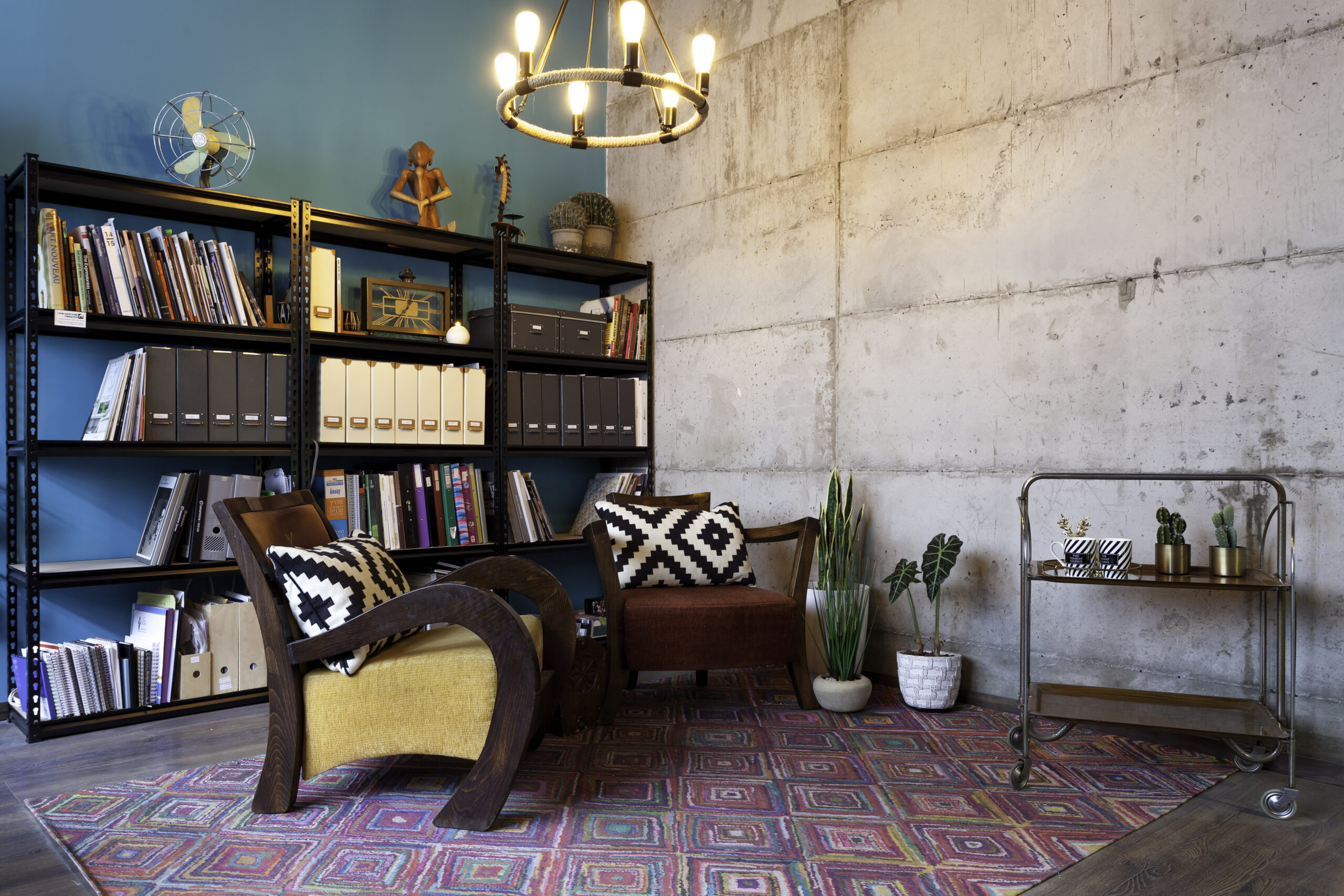 - הצבעוניות – קירות טורקיז עזים, שטיחים מלאי טקסטורה וכורסאות עם נוכחות – כי סטודיו חייב גם לשמח את הלב, לא רק את העין.