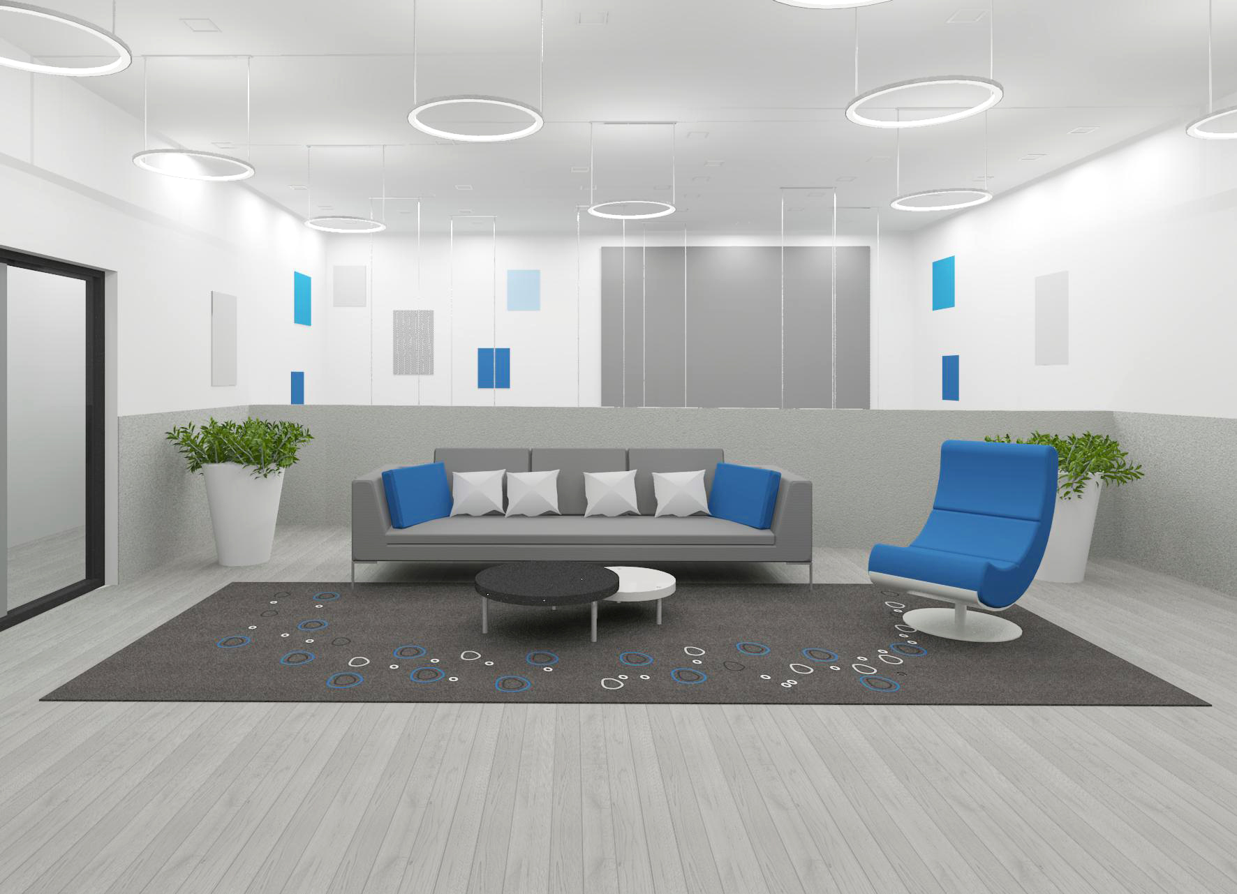 הוגדר שביל הליכה באמצעות שני סוגי פרקט, שהפרידו בין פינות הישיבה לדרך המובילה למעלית – תוך שמירה על זרימה והרמוניה.